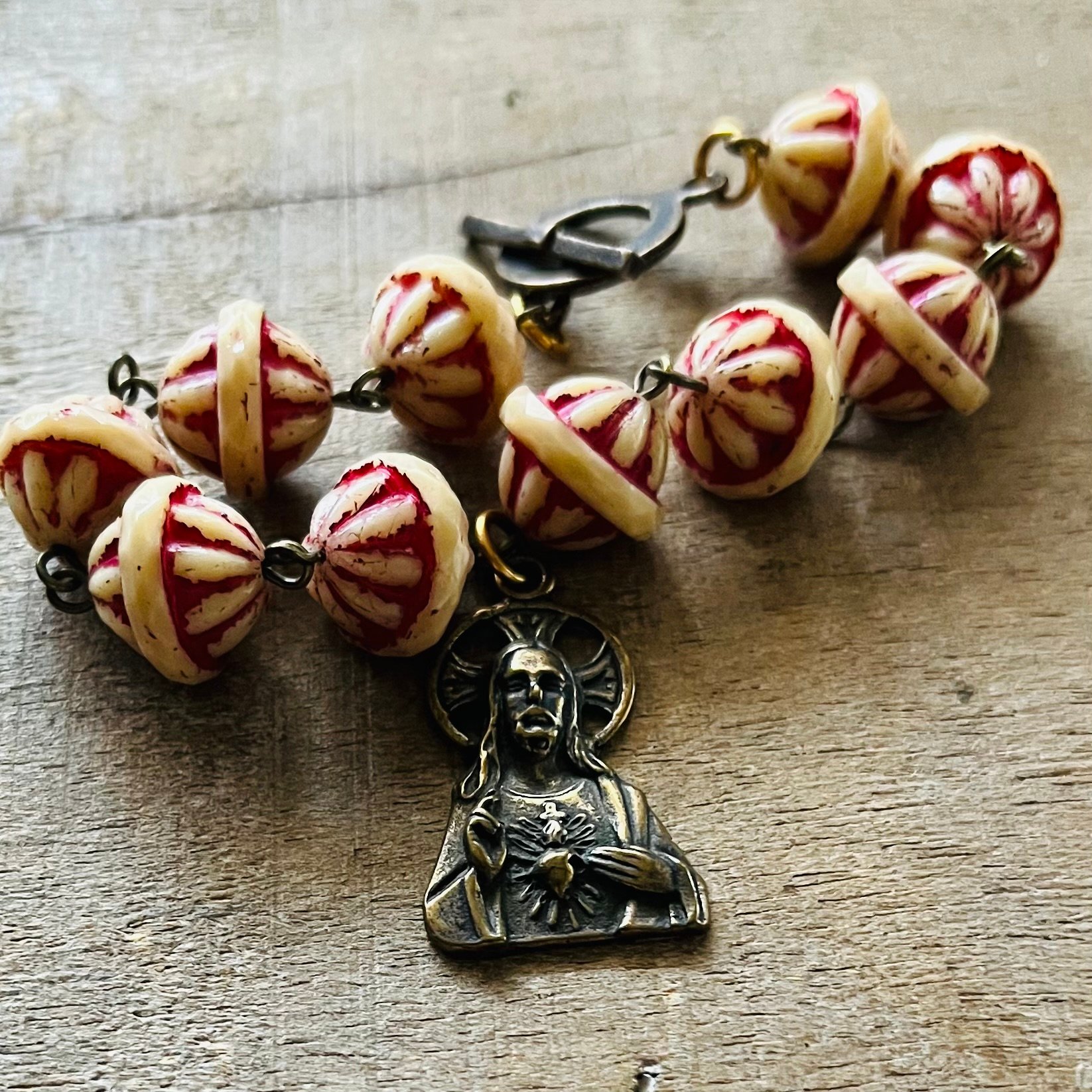 This beautiful Sacred Heart of Jesus medal is hand cast in solid bronze and adorned with beautiful 12mm beads in red and ivory. Wear this sacramental as a reminder of Jesus' love and mercy for us. Makes a wonderful gift for sacraments, birthdays, mothers, daughters, godmothers and anyone with a special devotion to the Sacred Heart of Jesus. The bracelet is 7 1/2". Comes in a muslin pouch.