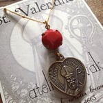 This beautiful St. Valentine medal is hand cast in solid bronze and suspended from a vintage red drop on a 18" gold filled chain. The necklace is 18" long with a 1 1/2" drop.